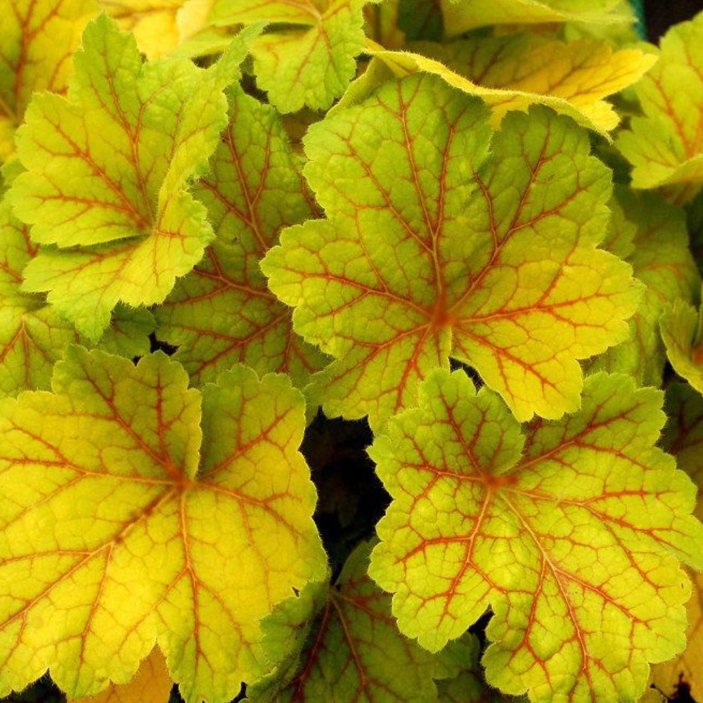 У гейхеры Электра листья ярко-желтые с контрастными красными прожилками весной и зеленовато-желтые летом. Красные прожилки остаются постоянно, независимо от времени года. Цветки белые, цветоносы невысокие. Цветет в мае, июне.