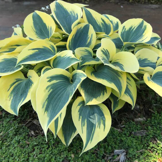середина сизо-зеленая, широкая кайма кремового или желтого цвета |