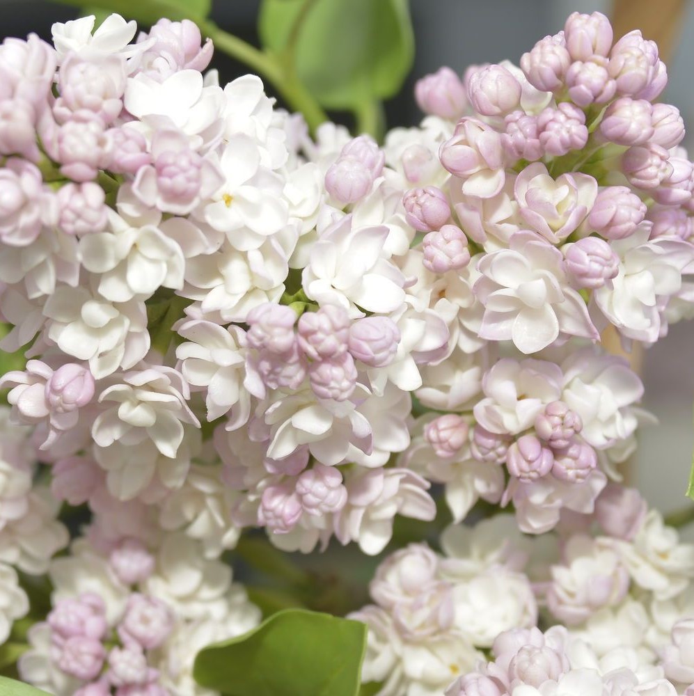 У сирени Красавица Москвы цветы очень похожи на полиантовые розочки, бутоны крупные, шаровидной формы. Оттенок розовато-белый с перламутровым отливом.