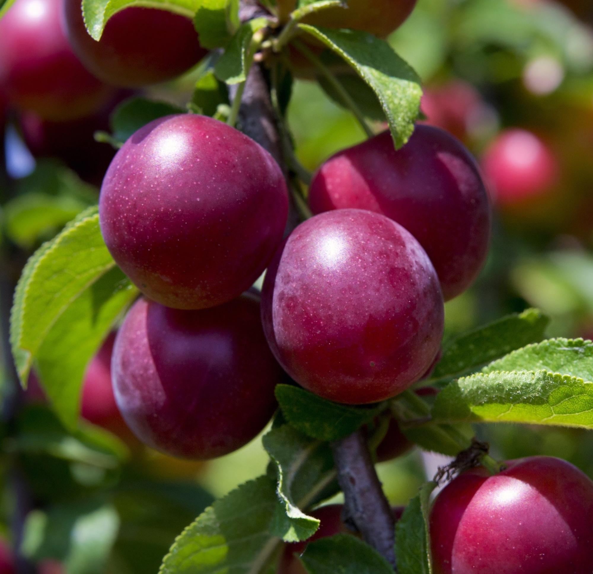 Плоды Маньчжурской красавицы среднего либо крупного размера, масса одной сливы — 15-20 г. Форма округлая, основание плоское, с глубокой узкой воронкой. Брюшной шов не выражен. Мякоть жёлто-зелёная, сочная, плотная. Структура рыхлая, аромат невыразительный, вкус кисло-сладкий. Кожица тёмно-бордового цвета с интенсивным голубоватым налётом, плотность средняя. Косточка средних размеров, овально-заострённой формы, плохо отделяется от мякоти. Плодоножка короткая, прочно прикреплена к плоду.